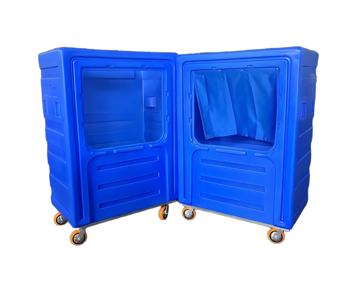 布草笼:酒店、洗衣房、服装厂等场所用于运输、存放或周转布草(如床单、被套、浴巾、台布等纺织用品)的专用容器,通常具备带轮、耐用、大容量等特点,便于移动和堆放。