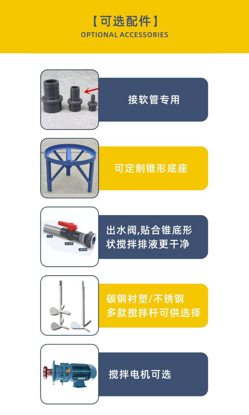 锥底储罐选用韩国进口食品级PE原料(LLDPE),产品一次性滚塑成型,无焊缝,耐磨耐老化。桶体为倾斜锥底和底部正中间锥底,配相应的支撑底架。桶内液体可一次排净,无残留物,方便清洗。产品广泛运用于供水蓄水,水处理、化工、环保、建筑、化工、稀土、染料、食品原料、医药等各行业。